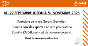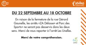 En raison de la fermeture de la rue Gérard Gaunelle, les arrêts «ZA Délasse» et Parc des Sports» ne seront pas desservis dans les deux sens. Merci de…